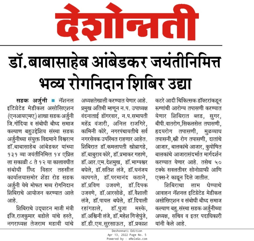 एन.आई.एम.ए. की 74 वीं वर्षगांठ के अवसर पर और डॉ. बाबासाहेब अम्बेडकर की 133 वीं जयंती के अवसर पर 14 अप्रैल को गोंदिया नीमा और सड़क अर्जुनी मेडिकल एसोसिएशन का एक भव्य मुफ्त स्वास्थ्य जांच शिविर आयोजित किया गया। शिबिरका उद्घाट्न राजकुमार जी बडोले माजी मंत्री व पालक मंत्री इनके करकमलोद्वारा किया गया । इस शिबिर मे २०० से अधिक रुग्ण लाभान्वित हुए ।