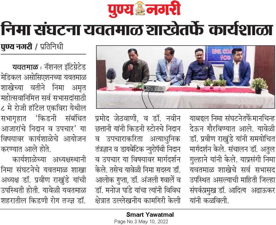 CME And Felicitation – Yavatmal Branch Posted on May 9, 2022May 10, 2022 by NIMA CC India Yavatmal NIMA brance arranged CME on Sunday 8/5/22.also we felicitates our NIMA members for their out standing work in medical as well as social field.