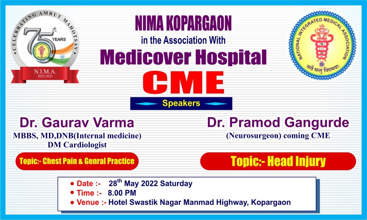 Nima kopargaon, Dist Ahmadnagar, Maharashtra Branch and Medicover Hospital – Sangamner organised 2nd CME on 29 May 2022 in our Amrutmohochav Year. Dr.Gaurav Verma, Cardiologist dilived 1 st Lecture on Chest Pain & General Practice and Dr.Pramod Gangurde diliverd 2 nd Lecture on Head Injury. More than 50 NIMA member’s attended this CME.