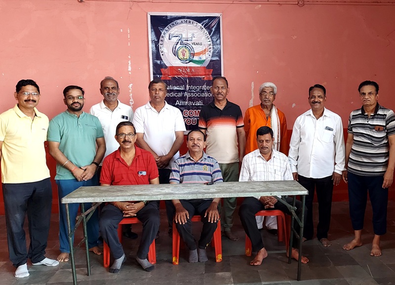 On the occasion of Nima Amrit Mahotsav year celebration and International Yoga Day. Yoga camp was organized by National Integrated Medical Association, Amravati (NIMA) on 21/06/2022 in the morning. The camp was conducted under the guidance of Yoga teacher Dr. Deepak Pochhi. The members first performed Dhanvantari Pujan and did yoga, pranayama asanas as per protocol.